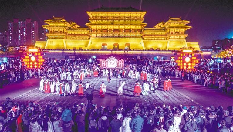 12月13日,河南省洛阳市隋唐洛阳城景区应天门北广场,游客在观看《神都狂欢》演出。景区通过增加演出场次、优化灯光效果等措施,为游客营造有感染力的沉浸式体验,激发冬日“夜经济”活力。
