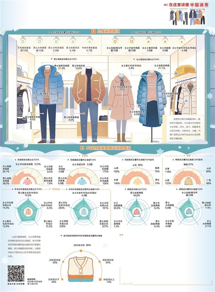 进入冬季,添置保暖新衣是许多家庭的“年度仪式”。消费数据显示,羽绒服稳居今年冬季保暖服饰成交额首位,是当之无愧的御寒首选。