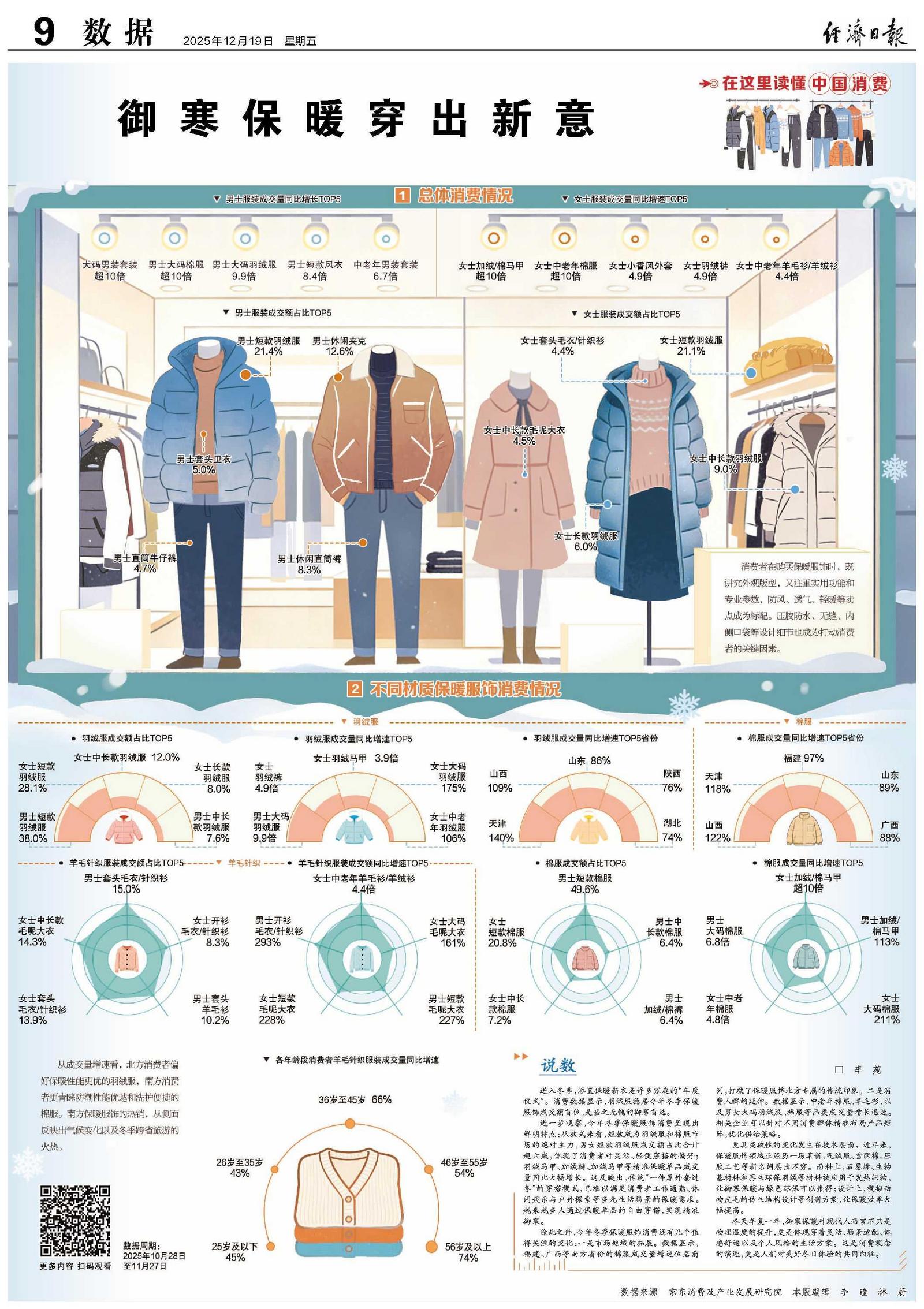 除此之外,今年冬季保暖服饰消费还有几个值得关注的变化:一是市场地域的拓展。数据显示,福建、广西等南方省份的棉服成交量增速位居前列,打破了保暖服饰北方专属的传统印象。二是消费人群的延伸。数据显示,中老年棉服、羊毛衫,以及男女大码羽绒服、棉服等品类成交量增长迅速。相关企业可以针对不同消费群体精准布局产品矩阵,优化供给策略。