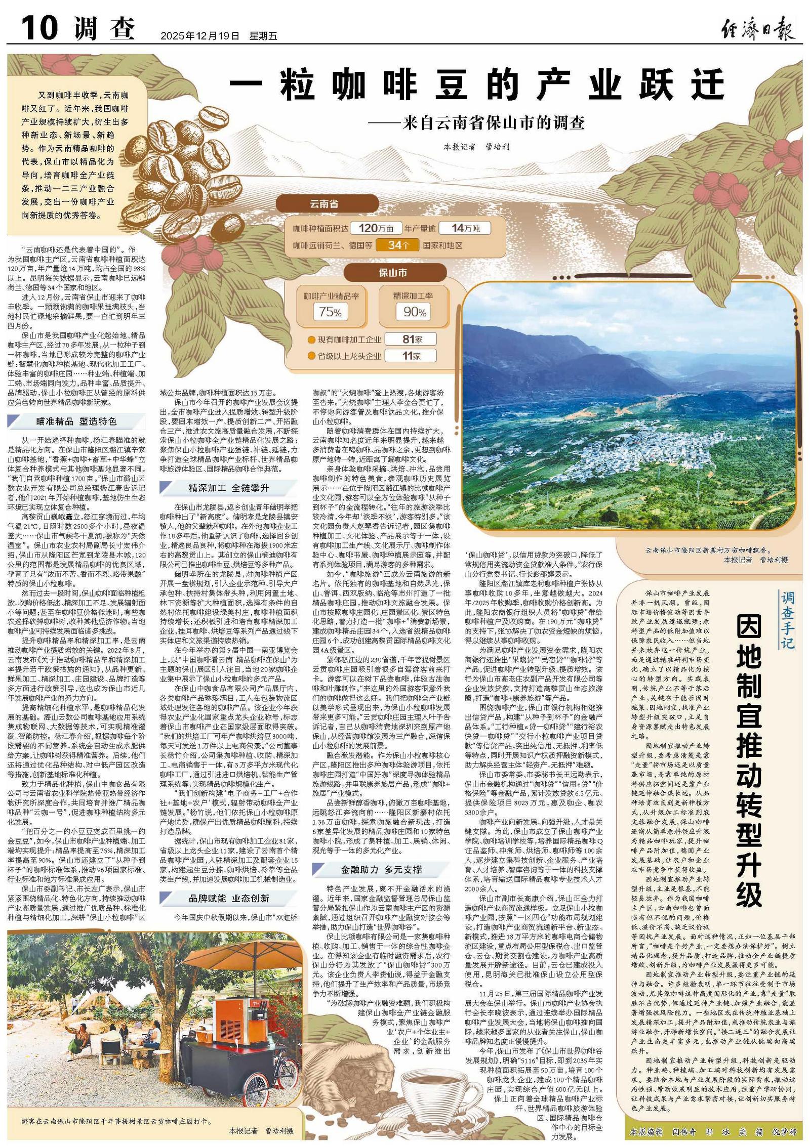 “为破解咖啡产业融资难题,我们积极构建保山咖啡全产业链金融服务模式,聚焦保山咖啡产业‘农户+个体业主+企业’的金融服务需求,创新推出‘保山咖啡贷’,以信用贷款为突破口,降低了常规信用类流动资金贷款准入条件。”农行保山分行党委书记、行长彭邵婷表示。