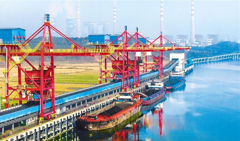 12月18日,江西宜春港丰城港区尚庄货运码头,桥吊起重机在装卸煤炭。入冬以来,当地有序调配电煤,做好运输、储备等工作,确保冬季能源稳定供应和生产生活用电安全平稳。