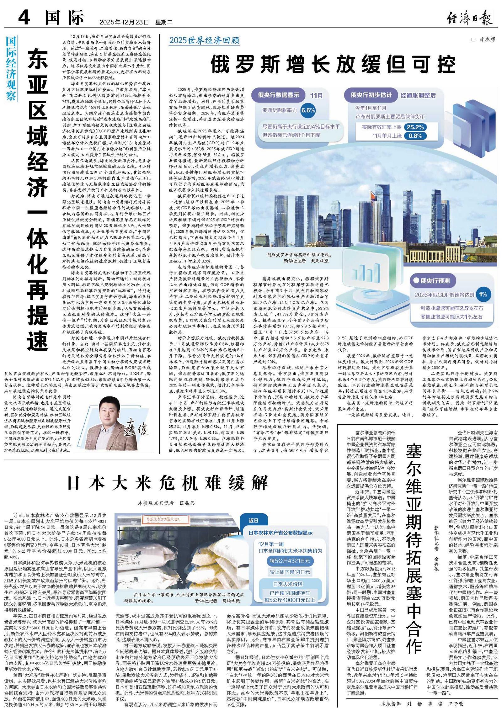 12月18日,海南自由贸易港全岛封关运作正式启动,中国最高水平开放形态的实践迈入新阶段。通过“一线放开、二线管住、岛内自由”的海关监管特殊制度,海南自贸港在促进区域供应链优化、规则对接、市场融合等方面展现出深远影响力。这不仅再次彰显出中国扩大高水平开放、同世界分享发展机遇的坚定决心,更将有力推动东亚区域经济一体化进程提速。