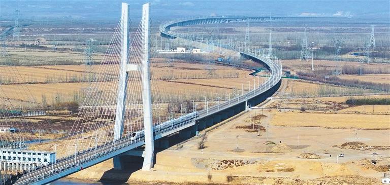 12月23日,包银高铁首发列车D4667次动车组行驶在乌海黄河特大桥。当日,包银高铁包惠段正式建成通车,包银高铁全线贯通运营,西北地区高铁路网进一步完善。袁宏彦摄(中经视觉)