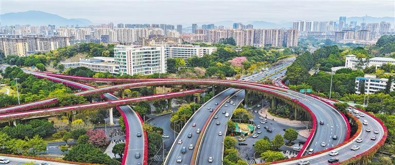 12月23日,车辆行驶在福建省福州市仓山区三角梅竞相开放的高架桥上。近年来,当地启用城市绿化养护监管系统,通过物联技术赋能,让绽放的三角梅扮靓城市。