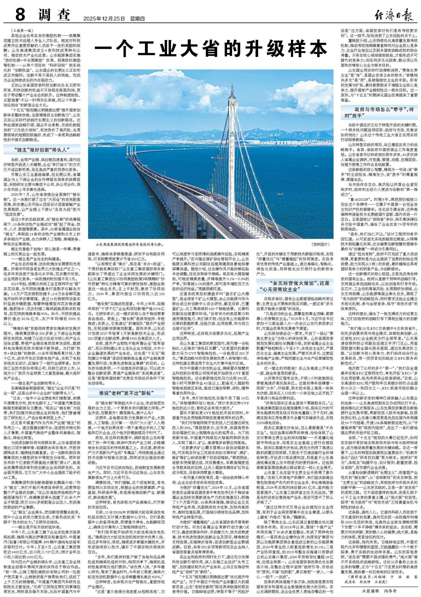当前,提升产业韧性不能再靠企业“孤军奋战”,而必须构建以本土龙头企业为枢纽、大中小企业融通发展的产业生态。这也是“十五五”规划建议中强调“滚动实施制造业重点产业链高质量发展行动,发展先进制造业集群”的目的。山东的实践表明,一个治理良好的国企,可以成为整合创新资源、贯通产业链条的“系统集成者”,这是“新型举国体制”优势在市场经济条件下的生动体现。