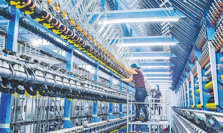 位于江苏省宿迁市宿城区龙河镇的江苏世成纺织科技有限公司生产车间里,工人在智能化生产线上忙碌。连日来,龙河镇工业园区近40家企业开足马力抓生产、赶订单、拓销路,打好全年收官战。 徐江海摄(中经视觉)