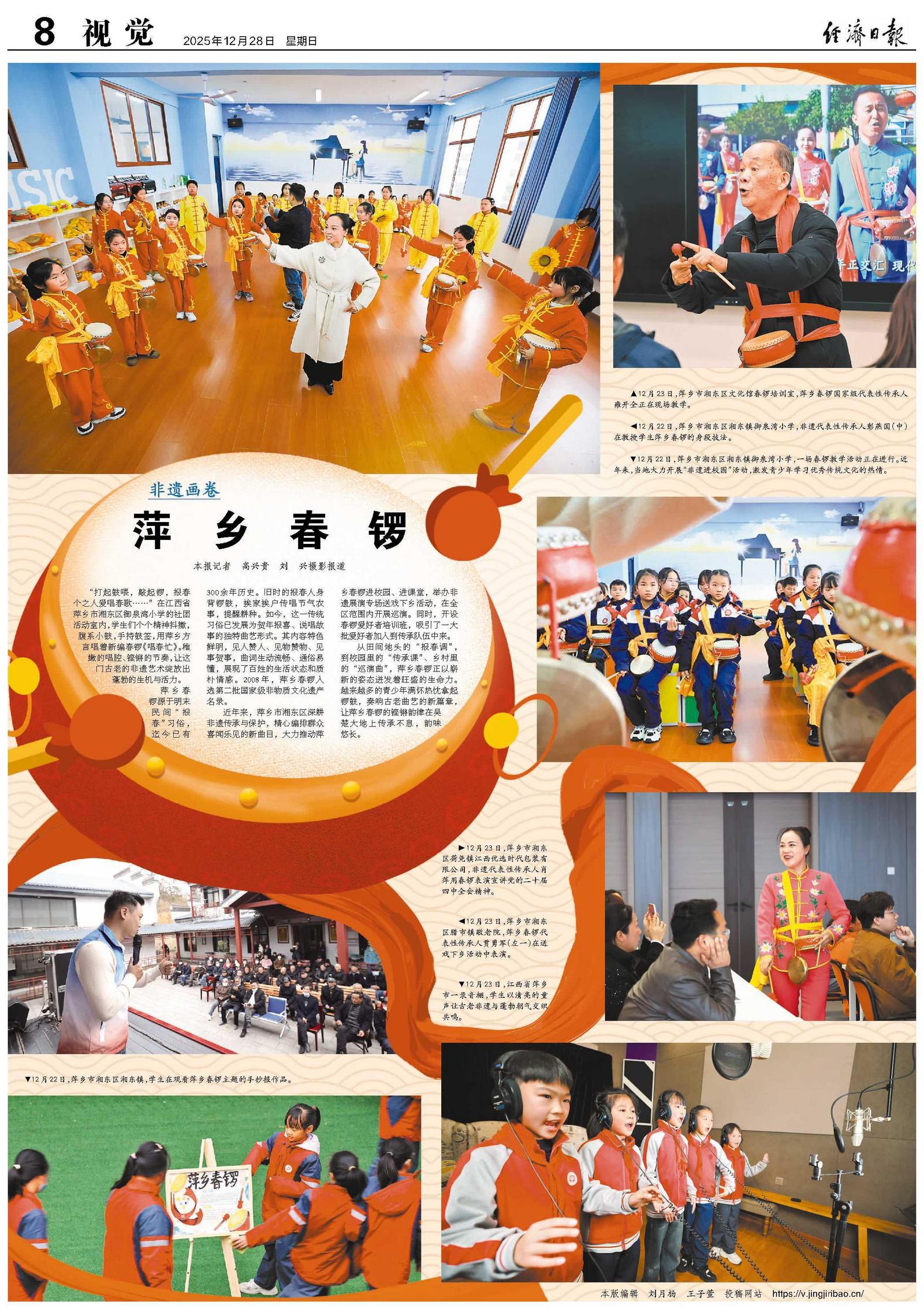 从田间地头的“报春调”,到校园里的“传承课”、乡村里的“巡演曲”,萍乡春锣正以崭新的姿态迸发着旺盛的生命力。越来越多的青少年满怀热忱拿起锣鼓,奏响古老曲艺的新篇章,让萍乡春锣的铿锵韵律在吴楚大地上传承不息,韵味悠长。
