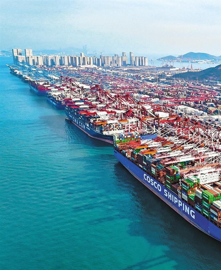 十二月二十七日,在山东港口青岛港前湾港区,多艘巨型货轮在装卸集装箱。当日,山东港口二〇二五年货物吞吐量超十九亿吨、集装箱量超四千七百万标准箱。张进刚摄(中经视觉)
