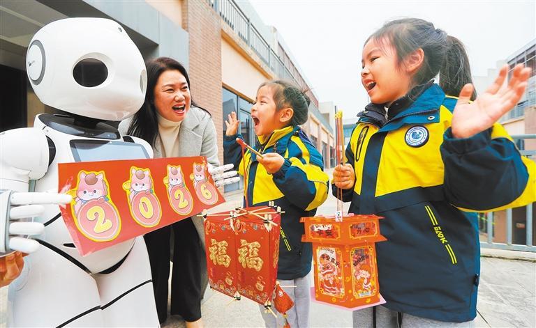 2025年12月29日,湖北省荆门市漳河新区双喜街道中心幼儿园举办“机器人新年派对”,孩子们与智能机器人亲密互动,互道“新年快乐”。