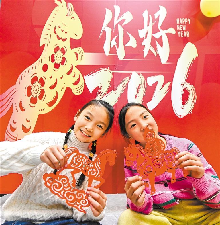 2025年12月28日,江西省南昌市青云谱区徐家坊街道塔子桥社区,孩子们在展示迎新年剪纸。