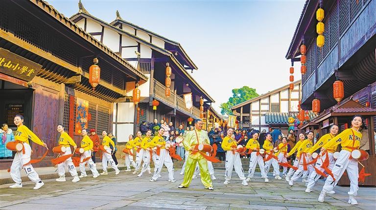 2025年12月28日,四川省广安市协兴老街开展腰鼓、川剧变脸等非遗民俗表演,喜迎元旦佳节。