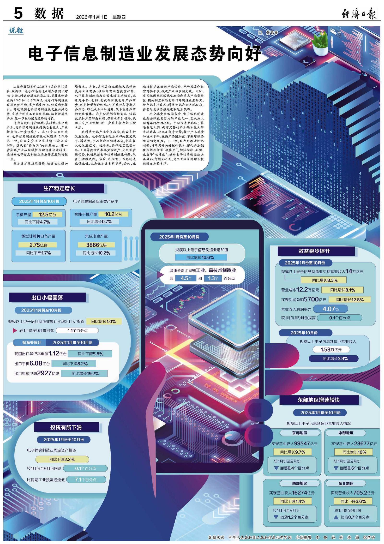 工信部数据显示,2025年1月份至10月份,规模以上电子信息制造业增加值同比增长10.6%,增速分别比同期工业、高技术制造业高4.5个和1.3个百分点,电子信息制造业发展态势平稳,生产稳定增长、效益稳步提升。持续巩固电子信息制造业发展向好态势,有助于巩固工业经济基础、培育新质生产力,进一步推动国民经济稳增长。