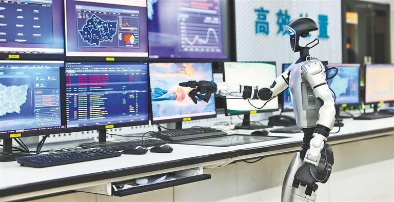 位于湖北省襄阳市的国网襄阳供电公司江北集控站监控大厅内,人形机器人专注“盯屏”。它能自动生成故障处置建议,遇到紧急情况还能自主拨打通知电话,让事故分析从15分钟缩短到秒级,故障处置准确率提升70%以上。王 虎摄(中经视觉)