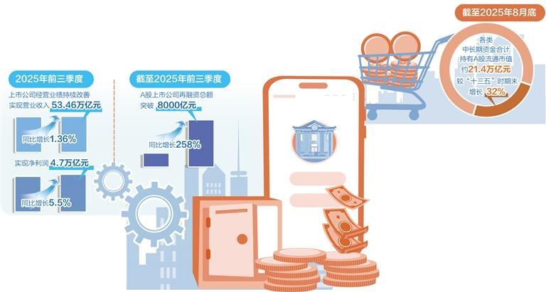 “长钱长投”制度体系加速构建。数据显示,截至2025年8月底,各类中长期资金合计持有A股流通市值约21.4万亿元,较“十三五”时期末增长32%。