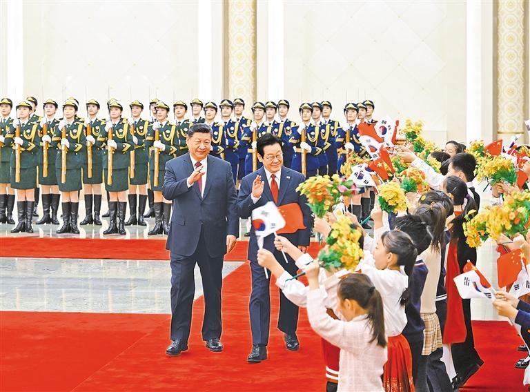 习近平指出,当前世界百年变局加速演进,国际形势更加变乱交织。中韩在维护地区和平、促进全球发展方面肩负重要责任,有广泛利益交集,应当坚定站在历史正确一边,作出正确战略选择。80多年前,中韩两国付出巨大民族牺牲,赢得抗击日本军国主义的胜利。今天更应携手捍卫二战胜利成果,守护东北亚和平稳定。作为经济全球化的受益者,中韩要共同反对保护主义,践行真正的多边主义,为推进平等有序的世界多极化、普惠包容的经济全球化作出贡献。