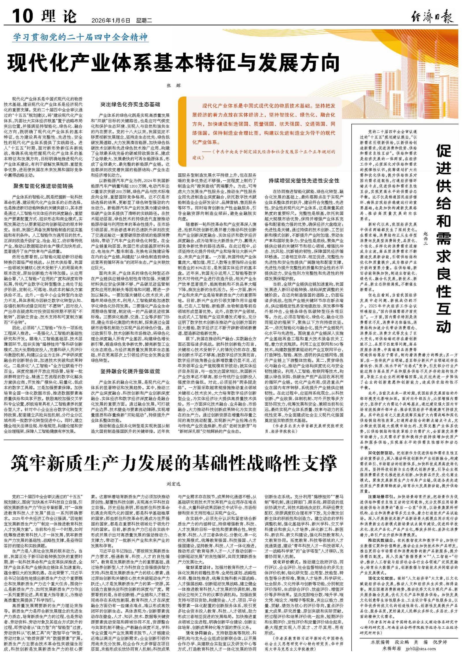 现代化产业体系是中国式现代化的物质技术基础,建设现代化产业体系是经济现代化的重要支撑。党的二十届四中全会审议通过的“十五五”规划建议,将“建设现代化产业体系,巩固壮大实体经济根基”置于战略布局突出位置,并强调坚持智能化、绿色化、融合化方向,既明确了现代化产业体系的基本特征,也为建设具有完整性、先进性、安全性的现代化产业体系提供了实践路径。进入“十五五”时期,面对新形势新任务新挑战,准确系统地把握现代化产业体系的基本特征和发展方向,目标明确地推进现代化产业体系建设,有利于破解发展瓶颈、重塑竞争优势,进而使我国在未来发展和国际竞争中赢得战略主动。