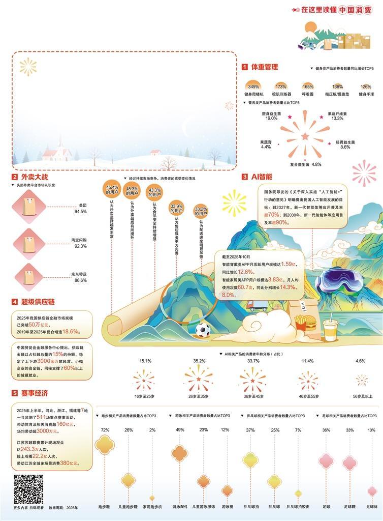 供应链与新消费共振,夯实科技消费基础。科技消费的蓬勃发展,离不开超级供应链的支撑。2025年,我国供应链金融市场规模突破50万亿元,以15%的社融份额稳定3000余万家中小微企业资金链,为科技产品研发、生产、流通提供资金保障。与此同时,机器人等科技新品类快速崛起,2025年上半年机器人产业营业收入同比增长27.8%,“人形机器人”等关键词搜索量同比激增百倍,从工业应用到家庭陪伴,机器人消费市场潜力持续释放。供应链的高效运转与新品类的创新突破,让科技消费既有广度又有深度。