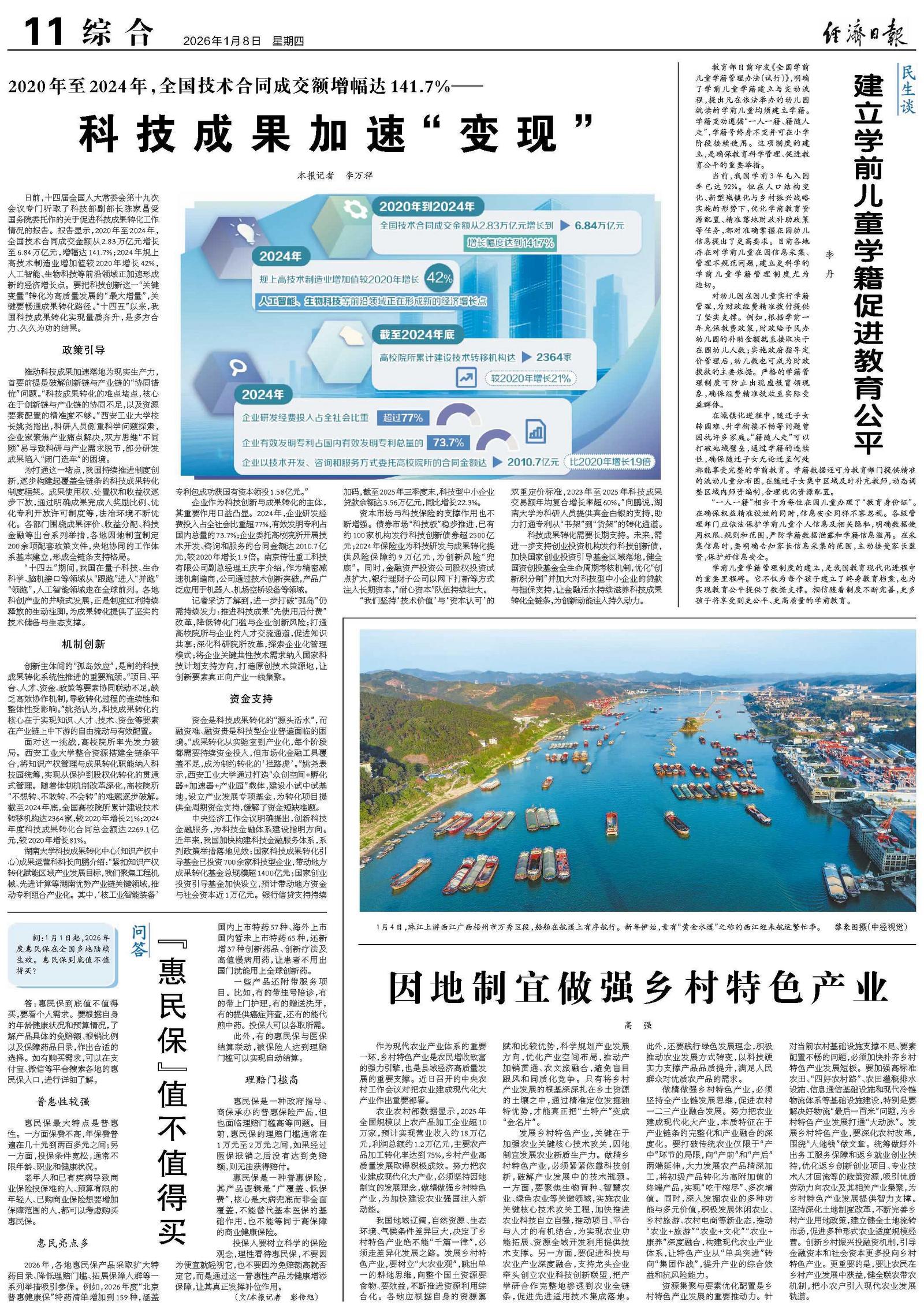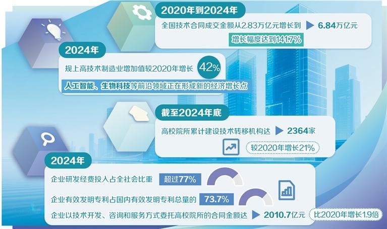 日前,十四届全国人大常委会第十九次会议专门听取了科技部副部长陈家昌受国务院委托作的关于促进科技成果转化工作情况的报告。报告显示,2020年至2024年,全国技术合同成交金额从2.83万亿元增长至6.84万亿元,增幅达141.7%;2024年规上高技术制造业增加值较2020年增长42%,人工智能、生物科技等前沿领域正加速形成新的经济增长点。要把科技创新这一“关键变量”转化为高质量发展的“最大增量”,关键要畅通成果转化路径。“十四五”以来,我国科技成果转化实现量质齐升,是多方合力、久久为功的结果。