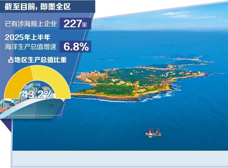 在海洋新能源领域,我国首个“渔业融合发展海上桩基固定式光伏项目”一期首批并网发电;在海洋渔业方面,全球首艘15万吨级智慧渔业大型养殖工船“鲁即渔养60617”的交付运营,让海洋渔业从“靠海吃海”迈入“农耕时代”……近年来,即墨区海洋经济发展方兴未艾,亮点频频。据介绍,截至目前,即墨全区已有227家涉海规上企业;2025年上半年,全区海洋生产总值增速6.8%,占地区生产总值比重达43.2%。