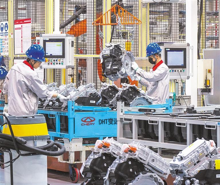 日前,在安徽省芜湖市繁昌经济开发区芜湖埃科动力系统有限公司智能生产车间,工人在生产混动变速箱。近年来,繁昌区强化科技攻关,依托“链主”企业推动新能源汽车产业提质增效,助力县域经济高质量发展。肖本祥摄(中经视觉)