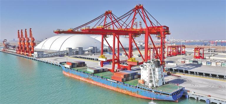 1月12日上午,“东海之源”集装箱货轮在东营港集装箱码头进行装箱作业。当天,东营—洋浦内外贸同船航线由该轮首航。该航线是青岛中远海运集装箱运输有限公司布局南北物流通道的重要航线,依托东营港优越的区位条件与完善的集疏运体系,构建起“黄河入海口产业腹地—海南自由贸易港”的直达链路。周广学摄(中经视觉)