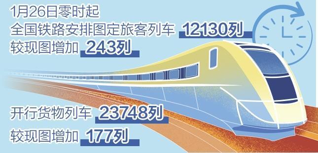 1月26日零时起,全国铁路将实行新的列车运行图。调图后,全国铁路安排图定旅客列车12130列,较现图增加243列;开行货物列车23748列,较现图增加177列,全国铁路客货运输能力和效率进一步提升,运输产品供给持续优化,将更好地服务经济社会高质量发展。