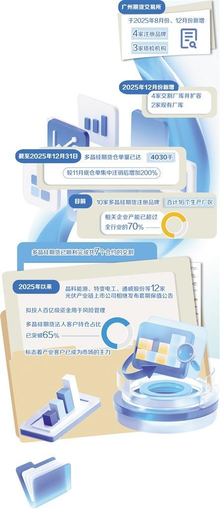 广期所于2025年8月份、12月份新增4家注册品牌,3家质检机构,12月份新增4家交割厂库并扩容2家现有厂库。截至2025年12月31日,多晶硅期货仓单量已达4030手,较11月底仓单集中注销后增加200%,实现新旧仓单平稳衔接。目前10家多晶硅期货注册品牌,合计16个生产厂区,相关企业产能已超过全行业的70%。截至目前,多晶硅期货已顺利完成共7个合约的交割。