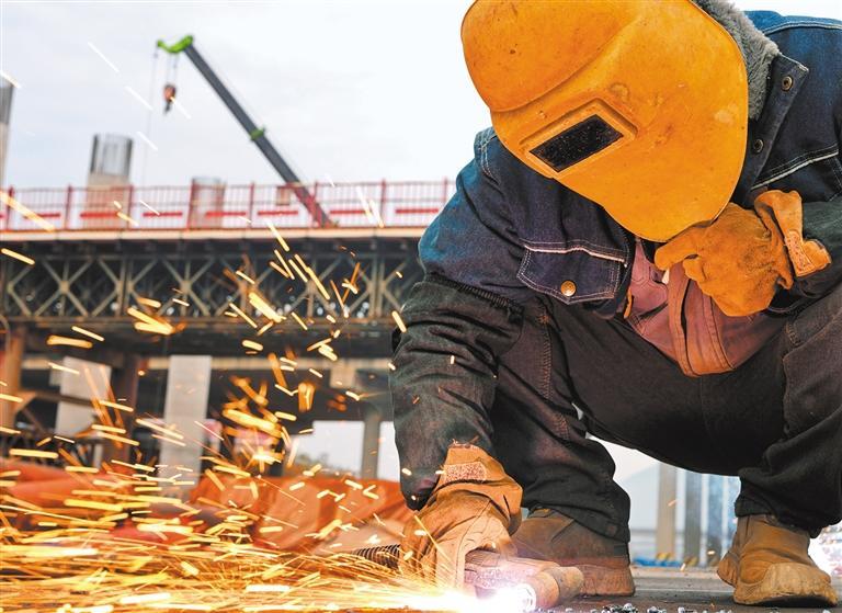 1月10日,湖南省衡东县新塘镇,工人在G4京港澳高速株洲至耒阳段扩容工程洣水特大桥项目工地施工作业。