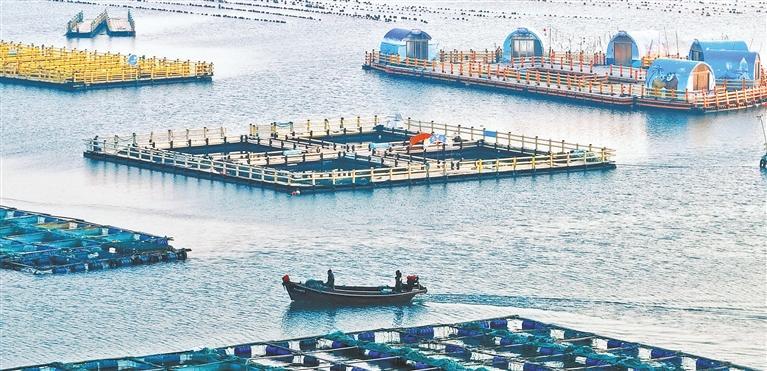 近年来,山东省荣成市海上粮仓生机勃发,以海为田开辟“蓝色经济”新途径,成为国家级海洋经济发展示范区和重要的海珍品养殖基地。图为在荣成市桑沟湾海洋牧场,养殖工人驾驶船只奔赴海参网箱养殖区从事冬季海上养殖管理。