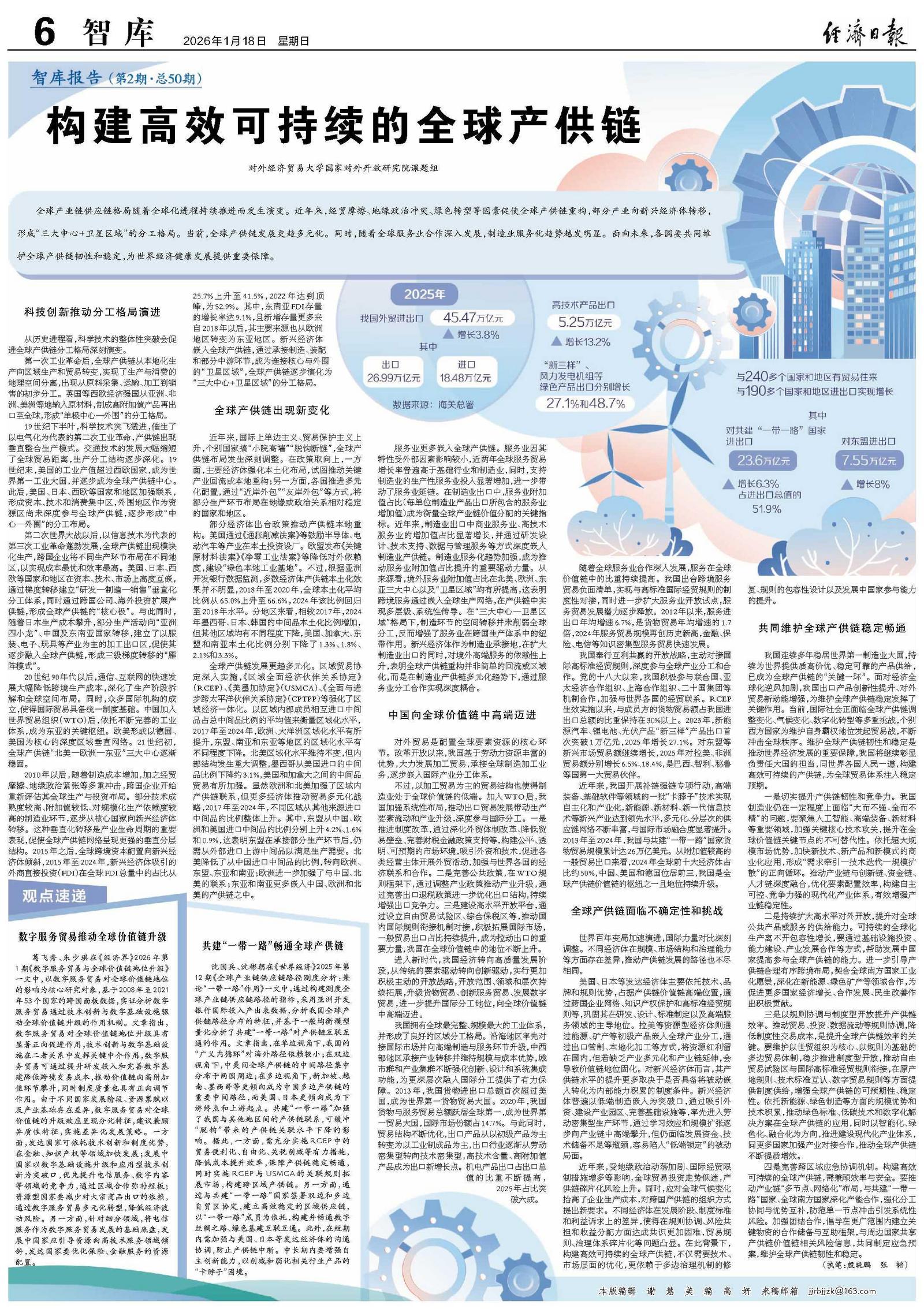三是以规则协调与制度型开放提升产供链效率。推动贸易、投资、数据流动等规则协调,降低制度性交易成本,是提升全球产供链效率的关键。要维护以世贸组织为核心、以规则为基础的多边贸易体制,稳步推进制度型开放,推动自由贸易试验区与国际高标准经贸规则衔接,在原产地规则、技术标准互认、数字贸易规则等方面提供制度供给,增强全球产供链的可预期性、稳定性。依托新能源、绿色制造等方面的规模优势和技术积累,推动绿色标准、低碳技术和数字化解决方案在全球产供链的应用,同时以智能化、绿色化、融合化为方向,推进建设现代化产业体系,同更多国家加强产业对接合作,推动全球产供链不断提质增效。