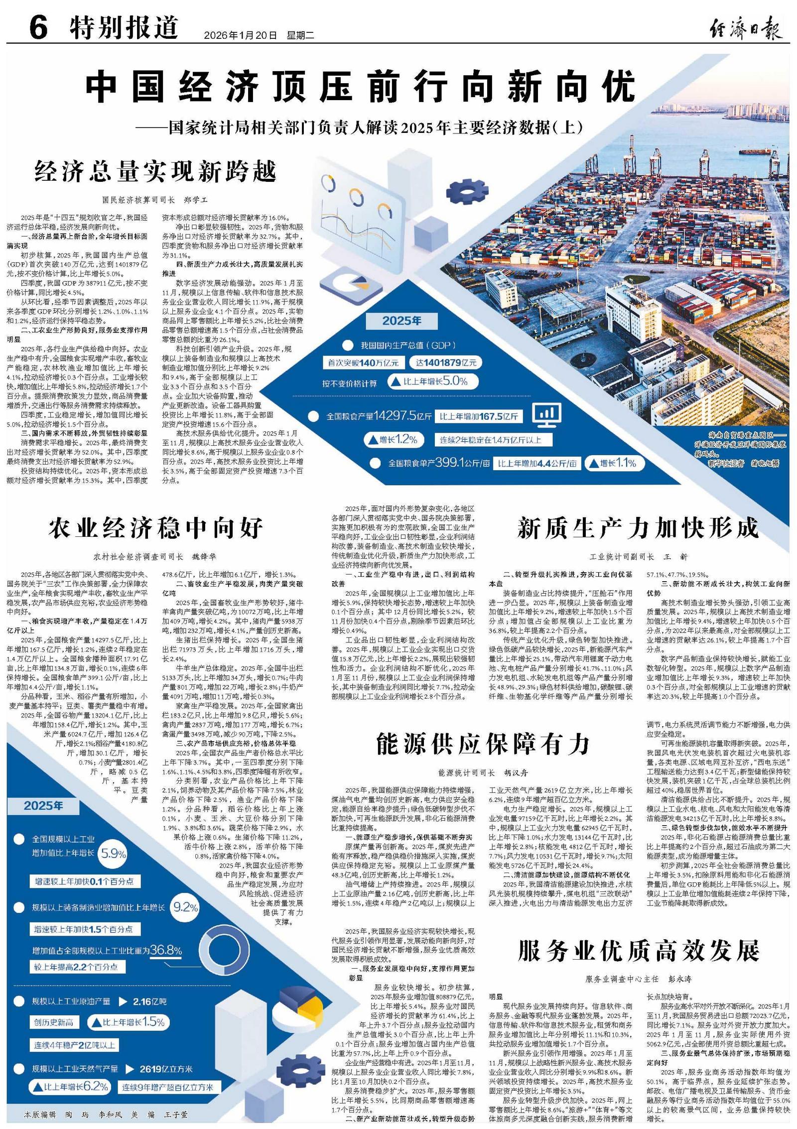 2025年,面对国内外形势复杂变化,各地区各部门深入贯彻落实党中央、国务院决策部署,实施更加积极有为的宏观政策,全国工业生产平稳向好,工业企业出口韧性彰显,企业利润结构改善,装备制造业、高技术制造业较快增长,传统制造业优化升级,新质生产力加快形成,工业经济持续向新向优发展。