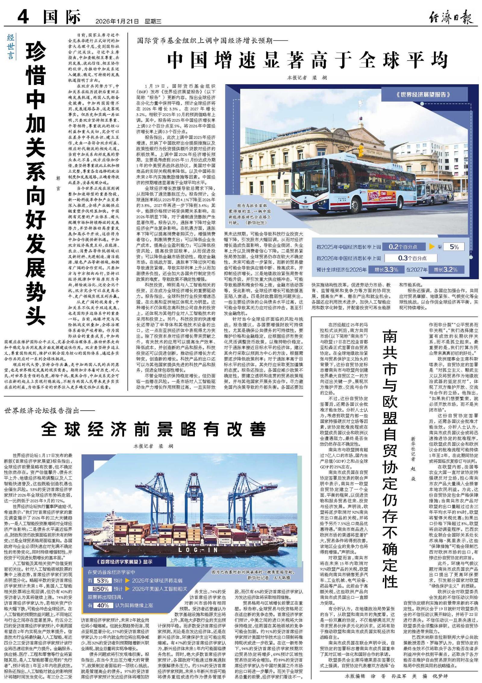 世界经济论坛执行董事萨迪娅·扎希迪表示:“我们对首席经济学家的意见调查揭示了2026年的三大关键趋势:一是人工智能投资激增将对全球经济产生影响;二是债务水平逼近临界点,财政和货币政策面临前所未有的转变;三是全球贸易格局面临重构。各国政府与企业必须快速应对充满不确定性的形势变化,同时持续增强韧性,并投资于可促进长期增长的基本面。”