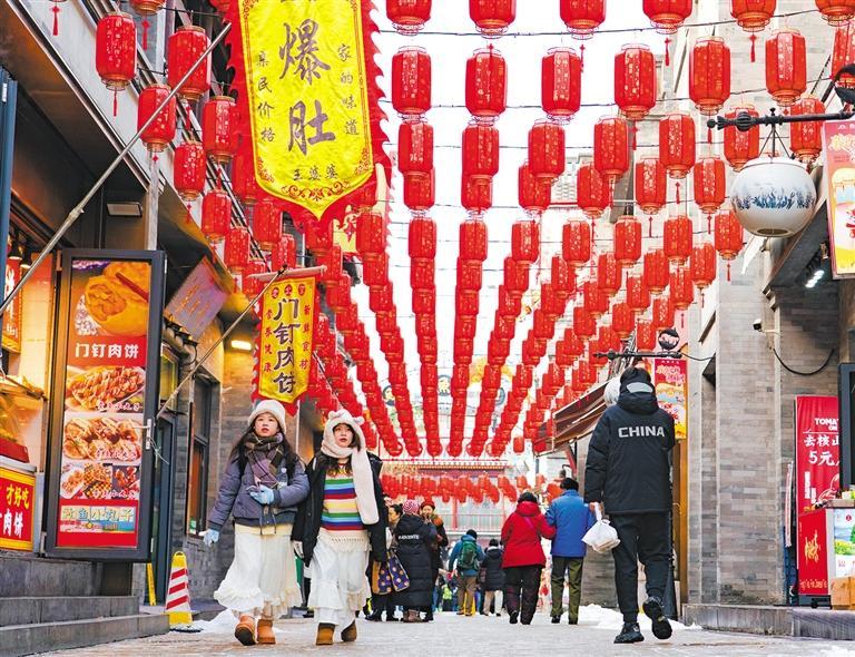 1月18日,游客在北京前门大街鲜鱼口游览观光。春节临近,北京许多商街景区集中悬挂灯饰,烘托出浓浓的节日氛围。 本报记者 赵 晶摄