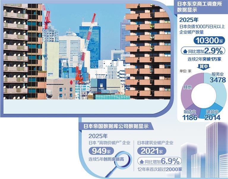 日本东京商工调查所统计数据显示,2025年,日本负债1000万日元以上的企业破产数量达到10300家,同比增加2.9%,连续2年突破1万家,为2013年以来最高水平;企业总负债为15921.9亿日元,大型企业破产减少,小型企业破产激增,其中负债未满1亿日元的企业占比达77%,创30年来最高。