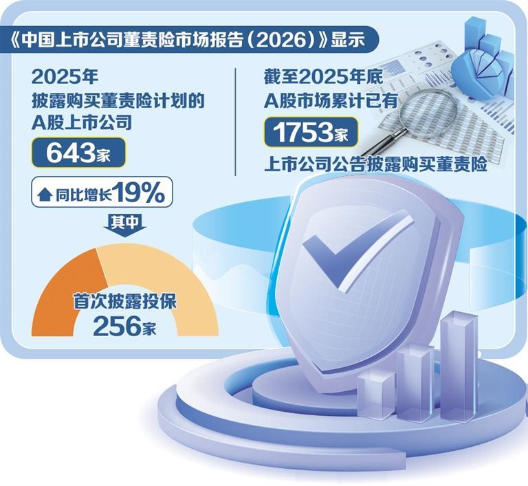 董责险正逐渐从上市公司的可选项变为必选项。近日,《中国上市公司董责险市场报告(2026)》(以下简称《报告》)在北京发布。《报告》显示,截至2025年底,A股市场累计已有1753家上市公司公告披露购买董事、监事及高级管理人员责任保险,投保渗透率突破三成,董责险正逐渐成为上市公司风险管理体系中的基础工具。
