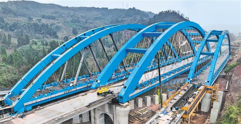 1月22日拍摄的正在建设中的西渝高铁跨营达高速公路大桥。当日,由中铁四局承建的西渝高铁跨营达高速公路大桥右联平稳落在桥墩上,标志全国首座高铁大跨度网状吊杆系杆拱桥全桥顶推完工,为全线按期通车奠定了基础。新华社记者 王 曦摄