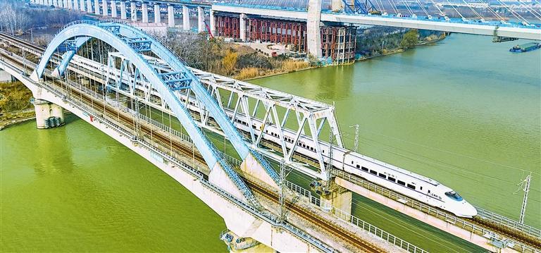1月25日,列车行驶在宁启铁路扬州段。1月26日零时起,全国铁路实行新的列车运行图。调图后,全国铁路安排图定旅客列车12130列,开行货物列车23748列,全国铁路客货运输能力和效率进一步提升。任 飞摄(新华社发)