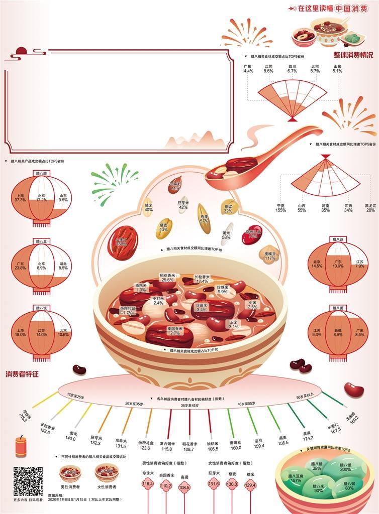地域消费的差异与融合,勾勒出腊八习俗的多元图景。广东以14.4%的腊八节食材成交额占比领跑全国,江苏、四川紧随其后,展现出南方地区对腊八节饮食习俗的重视。而宁夏155%的腊八节相关食材成交额同比增速尤为亮眼,印证了传统节日在各地的普及度不断提升。更具地域消费特色的是,上海消费者更青睐腊八醋,腊八豆则更受广东消费者偏爱,腊八饭在江苏更为流行,这种“一方水土一方食俗”的差异,正是传统文化多样性的鲜活注脚,也让节日氛围更显丰富立体。