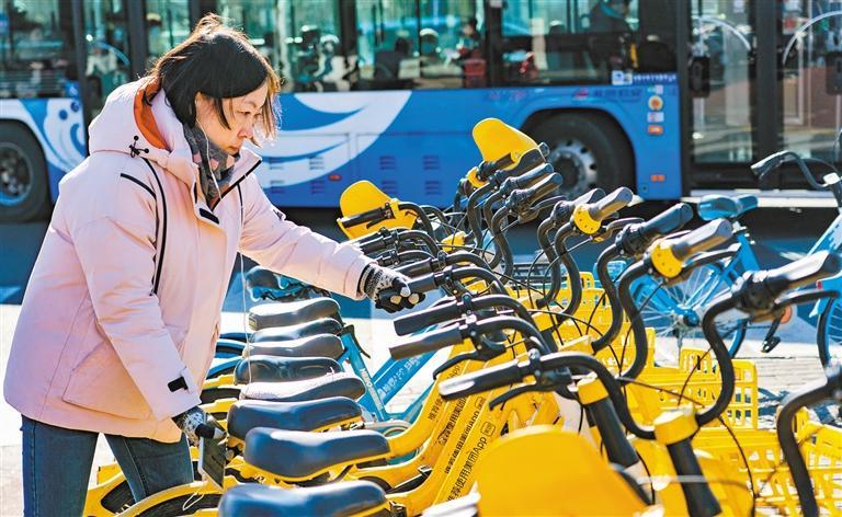 1月23日,市民在北京市西城区一地铁站外扫码共享单车。当前,越来越多的智能化共享模式走进我们的生活,为人们的日常出行提供更多便利选择。