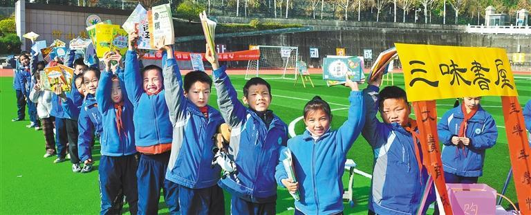 2025年12月16日,湖北省十堰市竹山县恒升小学,学生们展示在“跳蚤书市”上购买的二手图书。