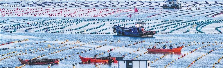 1月27日,养殖工人在山东省荣成市一海洋牧场养殖区开展生产作业。近年来,当地加快建设海洋生态牧场综合体,推动海洋经济绿色发展。李信君摄(中经视觉)