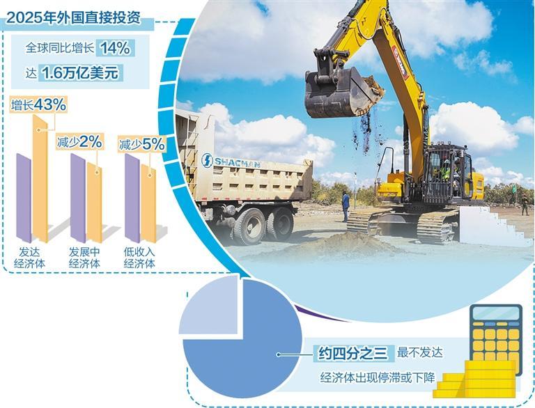 联合国贸易和发展会议(以下简称“贸发会议”)日前发布最新一期《全球投资趋势监测》报告指出,2025年全球外国直接投资(FDI)同比增长14%,达到1.6万亿美元,但增长主要是由于技术性反弹,并不意味着实体投资全面复苏。