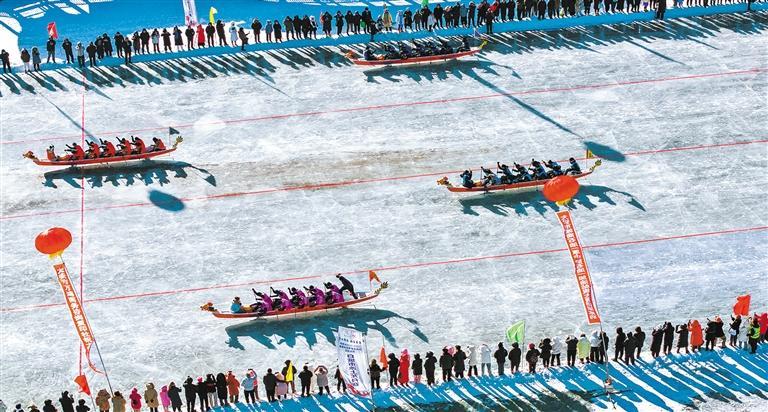 1月18日,吉林省白城市大安冰雪季文旅活动开幕,选手在嫩江湾嫩西湖上竞逐冰上龙舟。当地打造文旅+冰雪新业态,让冰雪“冷资源”变身富民“热产业”。