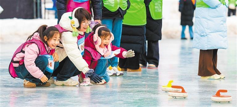 1月25日,内蒙古呼和浩特市大众冰雪季冰雪战队联赛活动现场,家长和小朋友在进行趣味冰壶比赛。内蒙古在冰雪季期间推出159项特色文旅活动,带动冰雪经济持续升温。