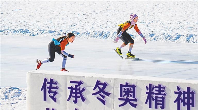 1月12日,新疆昌吉回族自治州奇台县第五中学冰场,运动员在比赛中你追我赶。昌吉州积极推进冰雪项目进校园,激发青少年对冰雪运动的热情。