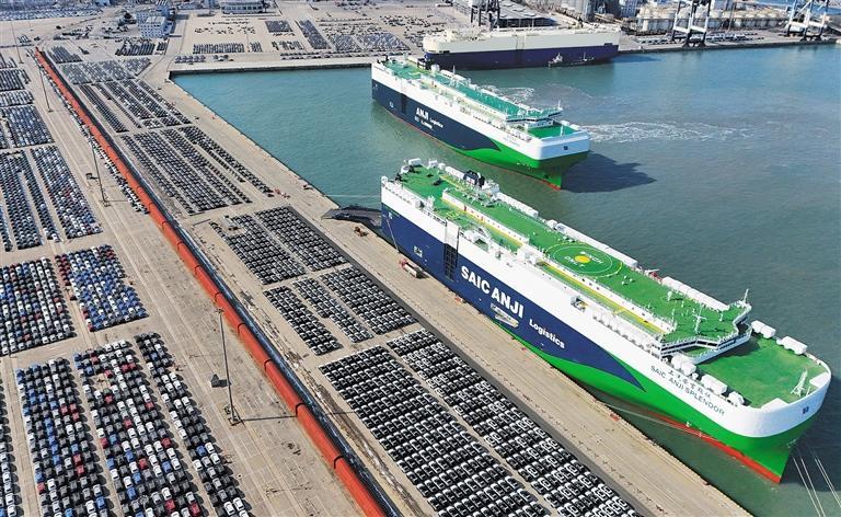 1月27日,汽车运输船在山东港口烟台港装运出口的国产汽车。据烟台海关统计,2025年,烟台港商品车发运量突破80万台。