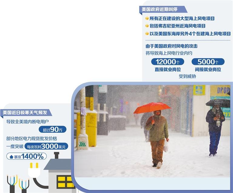 近日,美国极寒天气频发,导致全美境内超过90万用户断电,部分地区电力现货批发价格一度突破每兆瓦时3000美元,暴涨1400%。电价飙升同时引发缺电危机。而美国政府近期却以存在“国家安全风险”为由,叫停所有正在建设的大型海上风电项目。其中包括全美规模最大的弗吉尼亚州近海风电项目,以及美国东海岸另外4个在建海上风电项目。此令一出,市场哗然。5个被暂停的项目总容量达6吉瓦,足以支撑数百万户家庭用电。此举不仅令清洁能源产业猝不及防,更折射出美国能源战略中难以调和的深层矛盾。