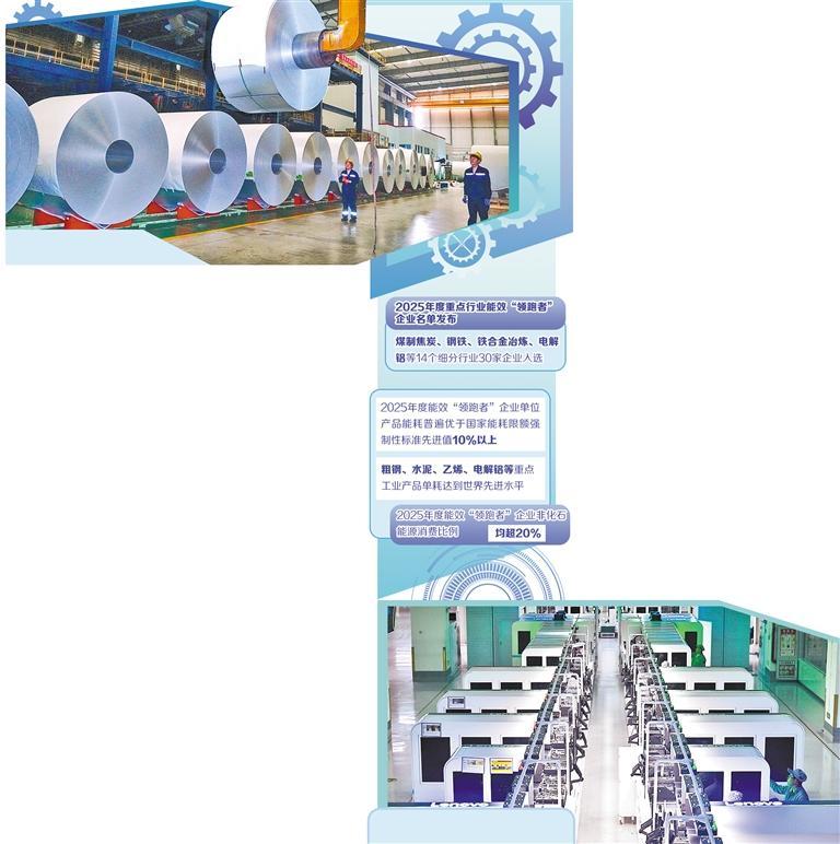 中国电子技术标准化研究院党委书记、副院长刘贤刚告诉记者,聚氯乙烯等行业2025年度能效“领跑者”企业单位产品能耗优于国家能耗限额强制性标准先进值10%以上,粗钢、水泥、乙烯、电解铝等重点工业产品单耗达到世界先进水平。与此同时,行业用能结构持续优化。一方面,通过自建可再生能源发电设施、实施化石燃料替代等,推动能源消费结构低碳化,2025年度能效“领跑者”企业的非化石能源消费比例均超过20%;另一方面,通过实施电能替代工艺装备改造,提升终端能源消费电气化水平。据相关部门测算,2024年工业领域电能占工业终端能源消费比重达28%。