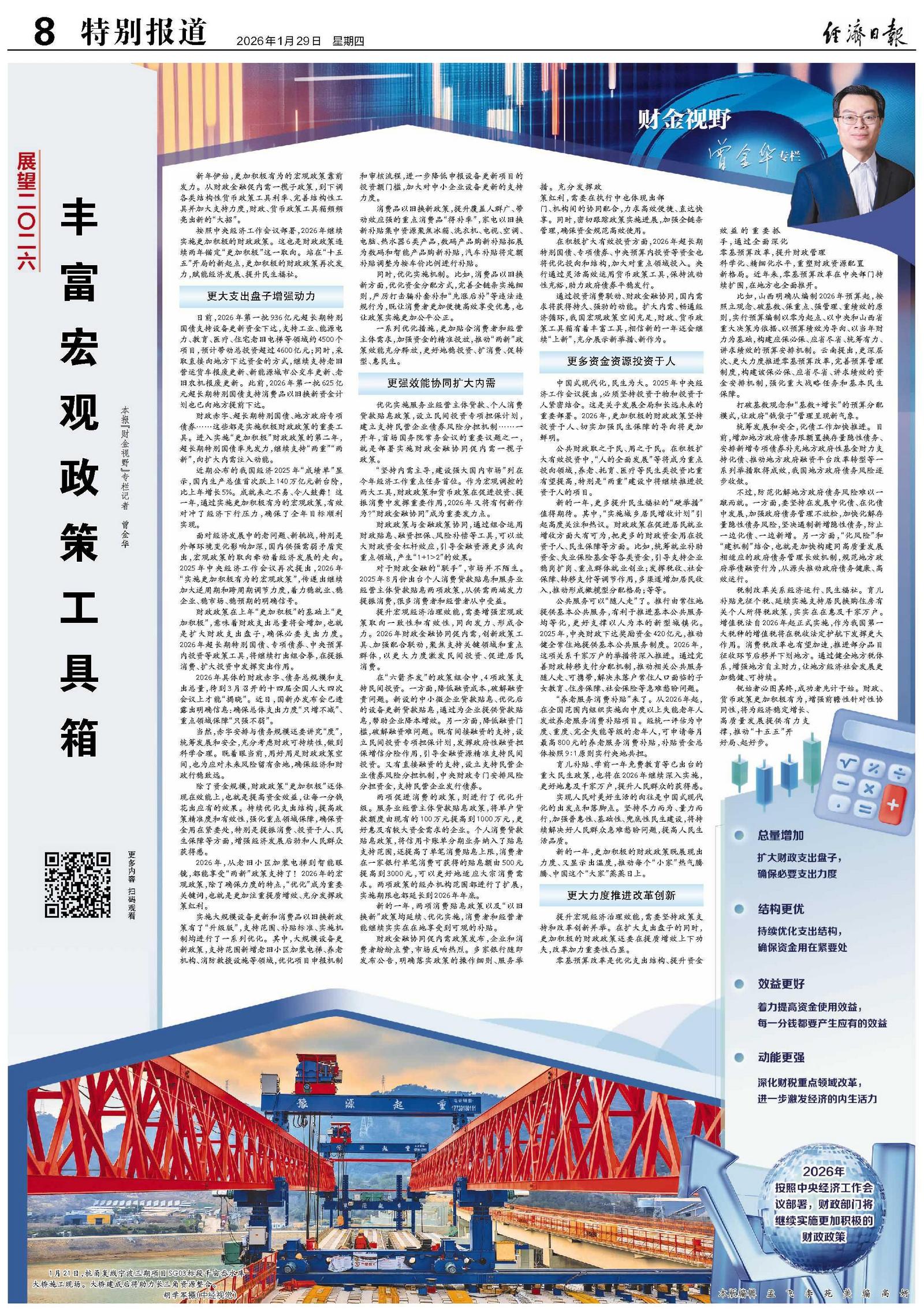 财政政策在上年“更加积极”的基础上“更加积极”,意味着财政支出总量将会增加,也就是扩大财政支出盘子,确保必要支出力度。2026年超长期特别国债、专项债券、中央预算内投资等政策工具,将继续打出组合拳,在提振消费、扩大投资中发挥突出作用。