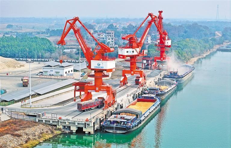 日前,江西省吉安市泰和县做好内河航运工作,确保春节期间企业正常生产运行不断档。图为在泰和县沿溪综合货运码头,起重机正在装卸货物。
